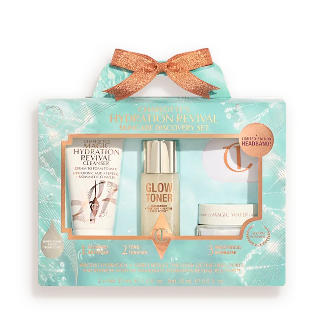 This kit includes my globally-loved Magic Hydration Revival Cleanser, Glow Toner and award-winning Magic Water Cream to cleanse, tone and moisturise, plus a spa-inspired white headband for ultimate relaxation!